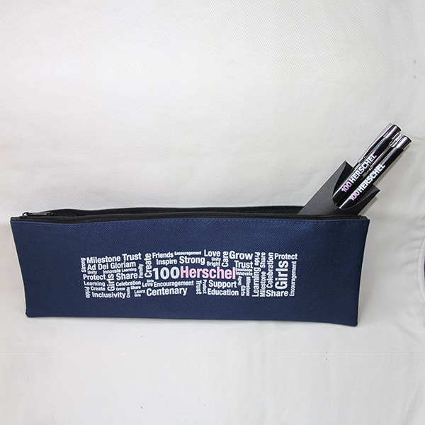A handy navy Herschel 100 zip up pencil case accompanied with a fun Herschel 100 pen and pencil set in their own case. All items are embossed with pink and white Herschel 100 text.